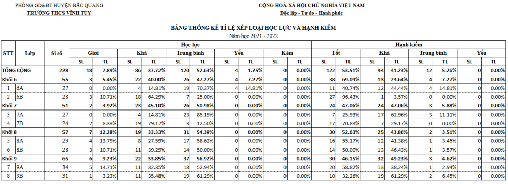 Kết quả cuối năm năm học 2021-2022