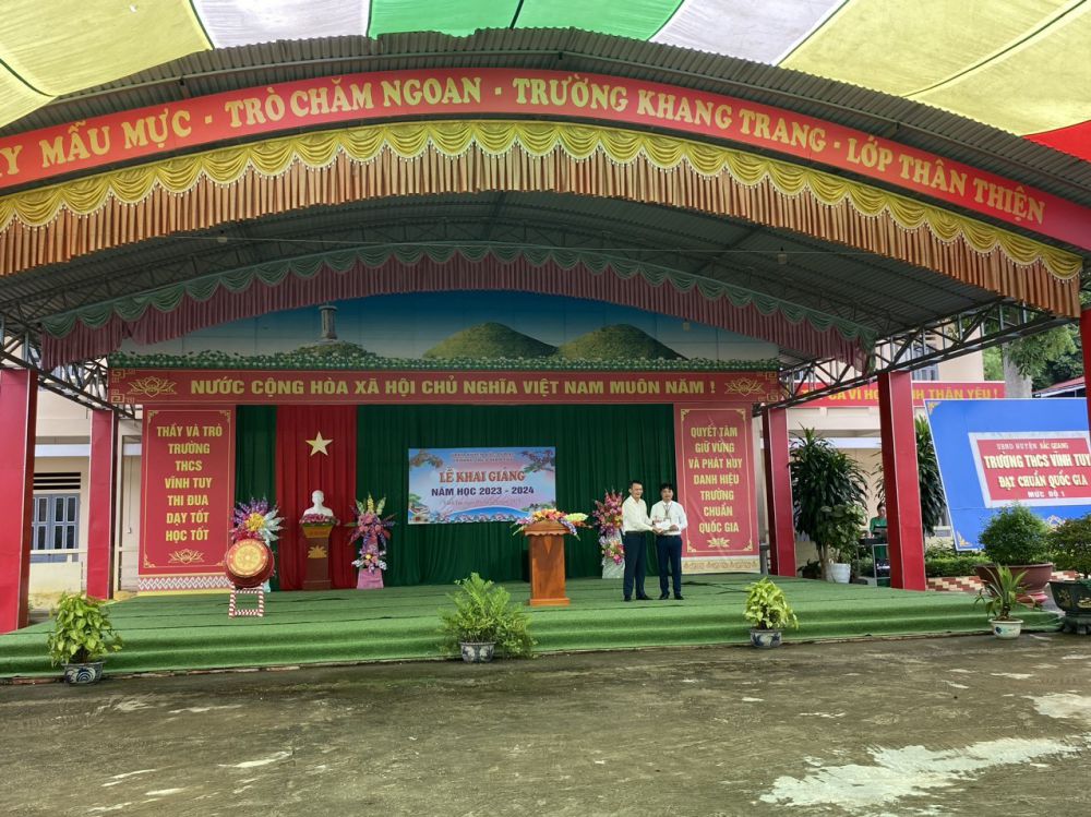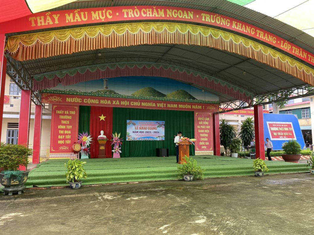 Năm học tới, đồng chí Hiệu trưởng nhà trường mong muốn thầy và trò Trường THCS Vĩnh Tuy quyết tâm đoàn kết, hăng say, nỗ lực hơn nữa để gặt hái nhiều thành công mới. Đồng chí cũng đề nghị toàn thể thầy và trò trường cần làm tốt 3 nhiệm vụ: Một, tiếp tục đổi mới nâng cao công tác quản lý và nâng cao chất lượng giáo dục toàn diện trong nhà trường. Tổ chức tốt các cuộc thi cấp trường, công tác bồi dưỡng học sinh giỏi các cấp; Hai, đẩy mạnh công tác xây dựng cơ sở vật chất, đầu tư trang thiết bị dạy học; Ba, xây dựng tập thể đoàn kết thống nhất thực hiện thắng lợi mục tiêu, nhiệm vụ năm học 2023-2024. Quyết tâm giữ vững tiêu chuẩn trường đạt chuẩn quốc gia và trường tiên tiến xuất sắc..jpg)